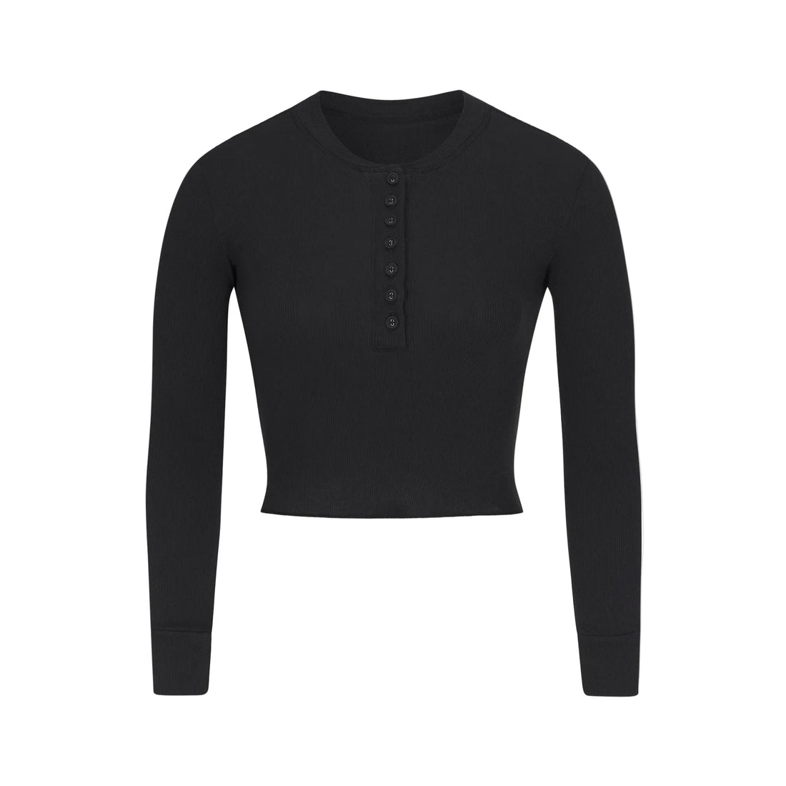COTTON RIB LONG SLEEVE CROP HENLEY SOOT