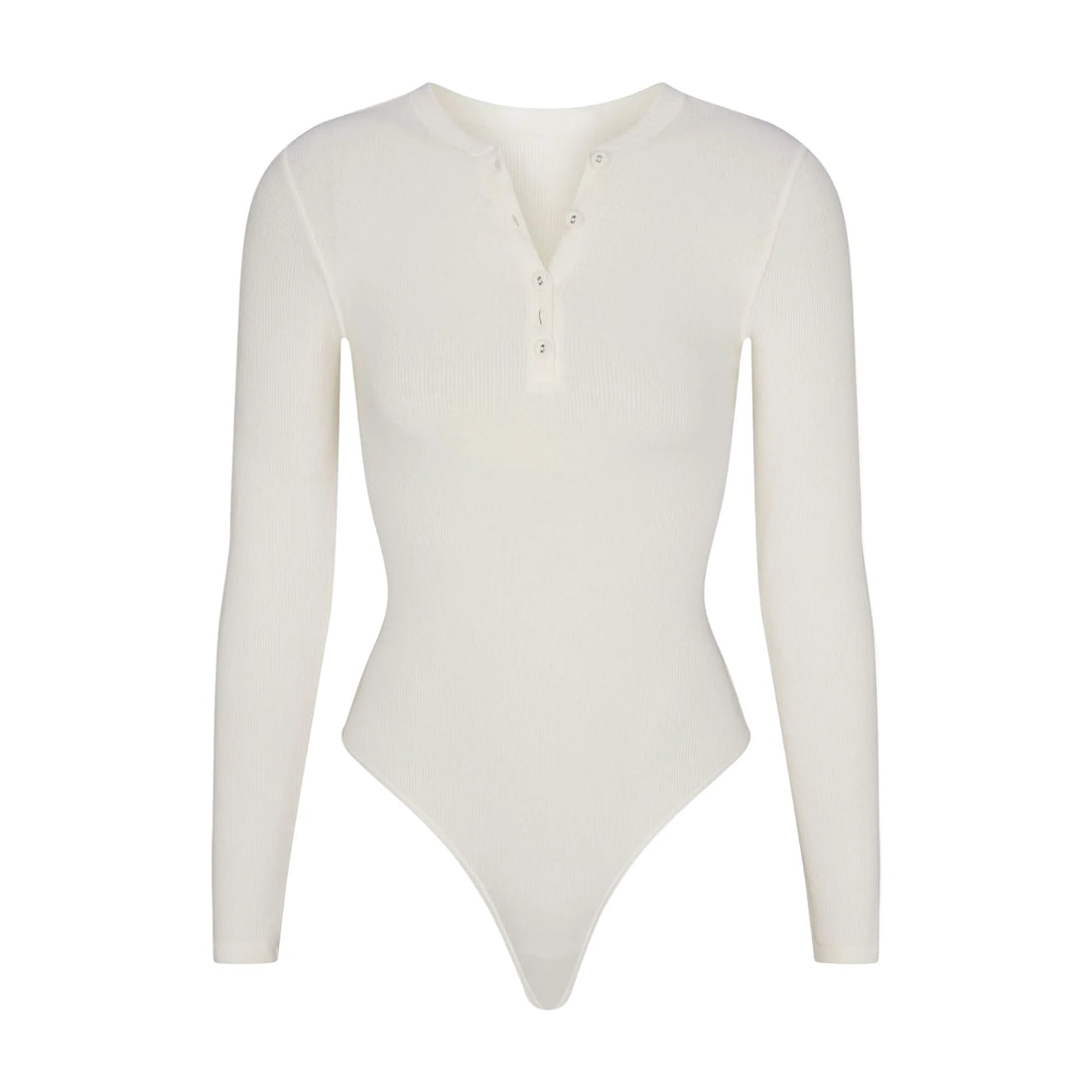 COTTON RIB LONG SLEEVE HENLEY BODYSUIT MARBLE