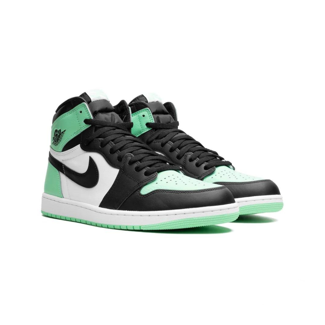 The Air Jordan 1 Retro High OG 'Green Glow' showcases 'Bred Toe' color blocking with vibrant pops of color. The smooth leather upper combines white side panels with contrasting black accents on the high-cut collar, forefoot overlay and signature Swoosh. Green Glow covers the toe box, heel and ankle flap, marked with a black Wings logo on the lateral side. A woven Nike Air tag adorns the black nylon tongue. Supporting the sneaker is a durable cupsole, featuring white sidewalls and a bright teal rubber outsole.