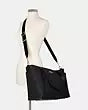 The Baby Bag is crafted of nylon and smooth leather—durable and comfortable for parents on the go. This diaper tote bag is designed to fit all your essentials, with an inside zip pocket and multifunction pocket to keep things organized. It also has a detachable strap for shoulder or crossbody wear to easily carry it while supporting your little one.