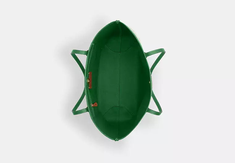 The City Tote Bag In Signature Canvas With Coach Graphic is a roomy and stylish carryall that makes a bold statement. Crafted in signature coated canvas, it features long 10” drop handles for comfortable wear on the shoulder. The open interior with a secure snap closure and an inside zip pocket provides both space and organization, making it a versatile everyday companion with a touch of modern branding.