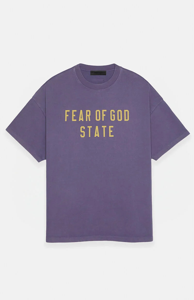 The Fear of God Essentials Lavender Heavy T-Shirt is made from a premium heavyweight cotton jersey and features a relaxed fit, short sleeves, a classic rib-knit crew neckline, a Fear of God State screenprint front graphic, and a rubber brand label on the front and at the upper back.