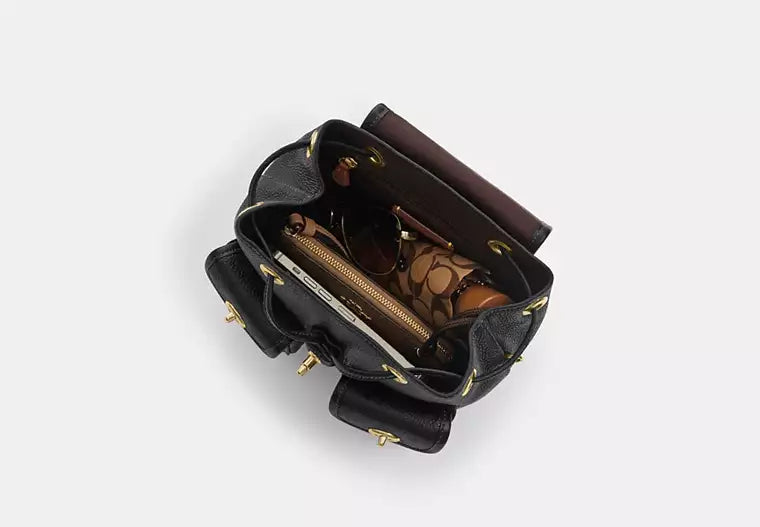 The Hadley Backpack In Signature Canvas combines refined design with practical functionality. Crafted from signature coated canvas, refined pebble leather, and smooth leather, it features top handles and detachable shoulder straps for versatile carry options. The backpack includes outside turnlock pockets, inside zip and multifunction pockets, and secure drawstring and turnlock closures, making it ideal for organized, stylish everyday use.