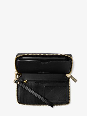 Traveling light just got easier with our latest Mercer wristlet phone bag. Crafted from pebbled leather, this stylish accessory features a removable strap, a zip closure, and glitter appliqués for a luxurious finish. We love the generous interior space for storing your phone, cards, and cash.