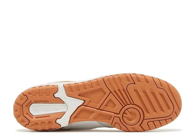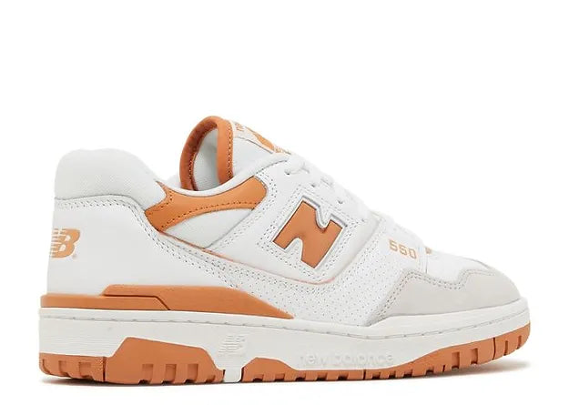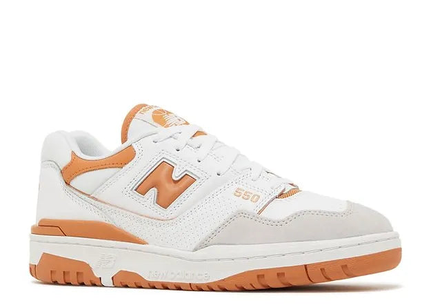 The New Balance 550 'Burnt Orange' offers a straightforward and minimalistic two-color combination for the classic basketball sneaker that debuted in 1989. The low-top design showcases an upper in white leather with muted orange accents including the prominent 'N' emblem that adorns the quarter panel, the woven New Balance tag on the tongue and the Flying NB logo imprinted on the heel. A light grey suede overlay provides added reinforcement to the forefoot. The shoe is anchored by a conventional rubber cupsole, which features amedial-side exposed foam wedge.