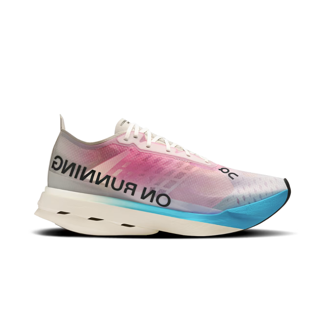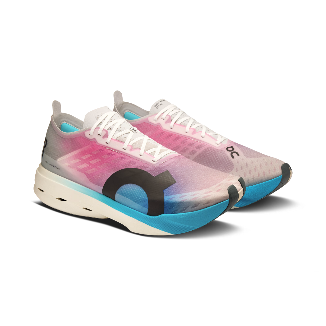 The On Running Cloudboom Strike White Horizon is a cutting-edge racing shoe engineered for elite-level road performance, pairing explosive propulsion with a sleek, minimal aesthetic. The upper is constructed from a featherweight, breathable mesh in a crisp white finish, offering a barely-there feel that promotes airflow and reduces drag. Soft “Horizon” blue accents appear subtly on the inner lining, heel tab, and branding, lending a cool, modern edge to the otherwise tonal design. Reinforcement is strategically placed in high-stress zones to ensure structural integrity without compromising the shoe’s ultralight profile. The midsole is powered by Helion™ HF hyper foam combined with a full-length carbon-infused Speedboard®, delivering high-energy return and snappy transitions ideal for aggressive racing. A rockered geometry encourages forward momentum, while the grippy rubber outsole features precision-cut segments for targeted traction and efficient ground contact. Built for race-day intensity, the Cloudboom Strike White Horizon blends futuristic aesthetics with performance innovation to help runners push beyond their limits.