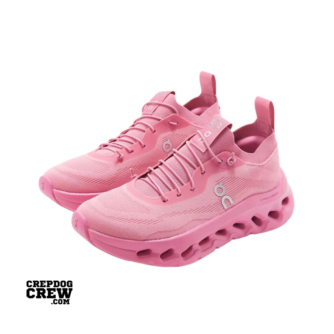 The On Running Cloudtilt LOEWE Wild Rose pairs a delicately woven jacquard mesh upper in soft blush tones with buttery calfskin leather overlays, creating a tactile contrast that feels as artisanal as it looks.