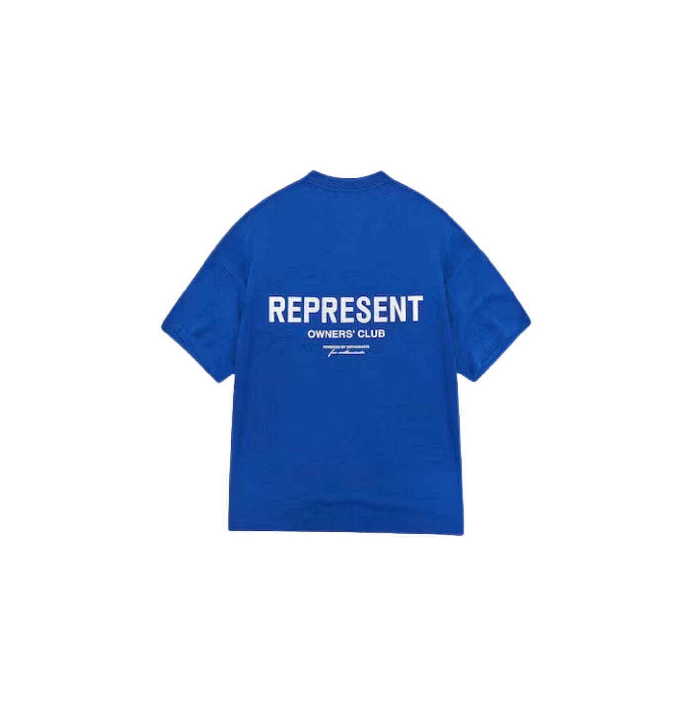 Short sleeve jersey cobalt blue t-shirt. Slightly oversized fit in a medium weight cotton. Ribbed crewneck collar. Represent Owners Club graphic branding to the rear and chest. This blue t-shirt is finished with our metal bar logo to the hem.