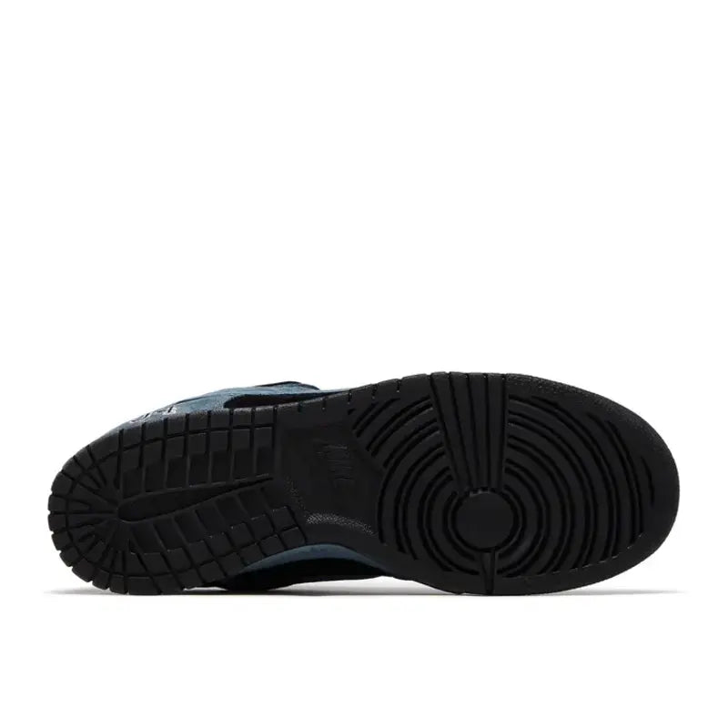 The Supreme x Nike Dunk Low SB 'Ocean Fog' rocks a black suede upper with marina blue overlays and a matching Swoosh. As a nod to Supreme's founding year, a '94' signoff adorns the heel. A Nike SB tongue tag brings the signature look, alongside a silver Nike wordmark embroidered on the back tab. The blue rubber midsole has a small 'Supreme' logo on the sidewall.