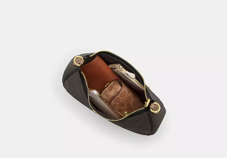 The Teri Hobo Bag in Blocked Signature Canvas is a modern, versatile silhouette designed for daily ease. With both a detachable handle and strap, it can be worn comfortably as a shoulder bag or crossbody. Crafted of durable signature coated canvas, it features multiple interior pockets and an exterior zip pocket for quick-access essentials. Stylish yet practical, this hobo bag is an ideal companion for everyday wear.