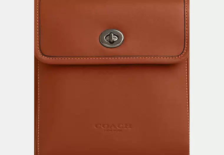The Turnlock Sling Pack is a versatile bag crafted from smooth grain leather. It features a fabric-lined interior, an outside turnlock pocket, a secure zip closure, a top handle with 2 inch drop, and an adjustable 50.5 inch shoulder strap for comfortable crossbody wear. Designed for everyday convenience, it blends sleek style with practical function.